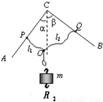 边与竖直方向的夹角分别为37°和53°.P、Q两个轻质小环分别套在CA、CB上,两根细绳的一端分别系在P、Q环上,另一端和一绳套系在一起,结点为O.将质量为m的钩码挂在绳套上,OP、OQ两根细绳拉直后的长度分别用l1、l2表示,受到的拉力分别用F1和F2表示(已知cos370=0.8,cos530=0.6)则