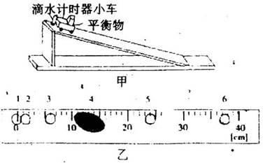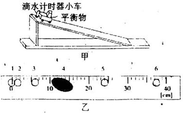 张丹同学用如图(甲)所示的滴水法测量一小车在斜面上运动时的加速度.实验过程上如下:在斜面上铺上白纸,用图钉钉住.把滴水计时器固定在小车的末端,在小车上固定一平衡物.调节滴水计时器的滴水速度,使其每0.2 s滴一滴(以滴水计时器内盛满水为准).在斜面顶端放置一浅盘,把小车放在斜面顶端,把调好的滴水计时器盛满水,使水滴能滴人浅盘内.随即在撤去浅盘的同时放开小车,于是水滴在白纸上留下标志小车运动规律的点迹.小车到达斜面底端时立即将小车移开.图(乙)为实验得到的一条纸带,用刻度尺量出相邻点之间的距离是s01=1.40 cm,s12=2.15 cm,s23=2.91 cm,s34=3.65 cm,s45=4.41 cm,s56=5.15 cm.