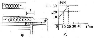 某同学在研究性学习中,利用所学的知识解决了如下问题:一轻弹簧一端固定于某一深度为h=0.25m、且开口向右的小筒中(没有外力作用时弹簧的下部分位于筒内),如图甲所示,如果本实验的长度测量工具只能测量出距筒口右端弹簧的长度l,现要测出弹簧的原长l0和弹簧的劲度系数,该同学通过改变挂钩码的个数来改变l,作出F—l变化的图线如图乙所示。