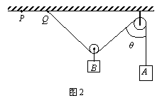 如图2所示,两物体A、B的质量分别为mA、mB,且mA>mB,整个系统处于静止状态。动滑轮的质量和一切摩擦均不计。如果将绳的一端由Q点缓慢地向左移到P点,整个系统重新平衡后,绳的拉力F和两滑轮间绳子与竖直方向的夹角θ变化情况是