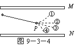 如图9-3-4所示,带有等量异种电荷的两块很大的平行金属板M、N水平正对放置,两板间有一带电微粒以速度v0沿直线运动,当微粒运动到P点时,迅速将M板上移一小段距离,则此后微粒的可能运动情况是