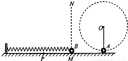 如图所示,水平地面上方被竖直线MN分隔成两部分,M点左侧地面粗糙,与B球间的动摩擦因数为μ=0.5,右侧光滑.MN右侧空间有一范围足够大的匀强电场.在O点用长为R=5m的轻质绝缘细绳,拴一个质量mA=0.04 kg,带电量为q=+2×10-4 C的小球A,在竖直平面内以v=10 m/s的速度做顺时针匀速圆周运动,小球A运动到最低点时与地面刚好不接触.处于原长的弹簧左端连在墙上,右端与不带电的小球B接触但不粘连,B球的质量mB=0.02 kg,此时B球刚好位于M点.现用水平向左的推力将B球缓慢推至P点(弹簧仍在弹性限度内),MP之间的距离为L=10 cm,推力所做的功是W=0.27 J,当撤去推力后,B球沿地面向右滑动恰好能和A球在最低点处发生正碰,并瞬间成为一个整体C(A、B、C均可视为质点),碰撞前后电荷量保持不变,碰后瞬间立即把匀强电场的场强大小变为E=6×103 N/C,电场方向不变.求:(取g=10 m/s2)