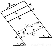 如图所示,两根足够长且平行的光滑金属导轨与水平面成53°固定放置,导轨间连接一阻值为4Ω的电阻R,导轨电阻忽略不计。在两平行虚线L1、L2间有一与导轨所在平面垂直、磁感应强度为B的匀强磁场,磁场区域的宽度为d=0.5m。导体棒a的质量为ma=0.6kg,电阻Ra=4Ω;导体棒b的质量为mb=0.2kg,电阻Rb=12Ω;它们分别垂直导轨放置并始终与导轨接触良好。现从图中的M、N处同时将它们由静止开始释放,运动过程中它们都能匀速穿过磁场区域,当b刚穿出磁场时,a正好进入磁场(g取10m/s2,sin53°=0.8,且不计a、b之间电流的相互作用)。求: