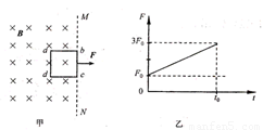 如图甲所示,MN左侧有一垂直纸面向里的匀强磁场。现将一边长为l、质量为m、电阻为R的正方形金属线框置于该磁场中,使线框平面与磁铁场垂直,且bc边与磁场边界MN重合。当t=t0时,对线框的ad边与磁场边界MN重合。图乙为拉力F随时间变化的图线。由以上条件可知,磁场的磁感应强度B的大小为