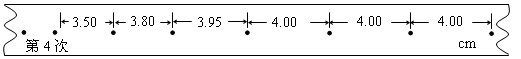 (3)实验中先后用同样的橡皮筋1条、2条、3条……,并起来挂在小车的前端进行多次实验,每次都要把小车拉到同一位置再释放小车。把第1次只挂1条橡皮筋对小车做的功记为W,第2次挂2条橡皮筋时橡皮筋对小车做的功为2W,……;橡皮筋对小车做功后而获得的速度可由打点计时器打出的纸带测出。根据第4次实验的纸带(如图所示)求得小车获得的速度为 m/s。(频率为50赫兹)![]()