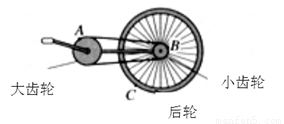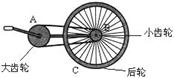 如图所示,自行车的大齿轮、小齿轮、后轮三个轮子的半径不一样,它们的边缘有三个点A、B、C.下列说法中正确的是 ( )![]()