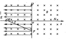 如图所示,在地面附近,坐标系xOy在竖直平面内的空间中存在着沿水平方向垂直纸面向里的匀强磁场,磁感应强度为B,在x<0的空间内还有沿x轴负方向的匀强电场,场强大小为E。一个带正电的油滴经图中x轴上的M点,始终沿着与水平方向成θ=30°角的斜向下做直线运动,进入x>0区域。要使油滴进入x>0的区域后能在竖直平面内做匀速圆周运动,需要在x>0区域加一个匀强电场E′。若带电油滴做匀速圆周运动通过x轴上的N点,且MO=NO,g取l0m/s2。求: