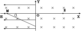 如图所示,在地面附近,坐标系xOy在竖直平面内,空间有沿水平方向垂直于纸面向里的匀强磁场,磁感应强度为B,在x<0的区域内还有沿X轴负向的匀强电场,场强大小为E。一个带正电油滴经图中x轴上的M点,沿着与水平方向成α=300角斜向下做直线运动,进入x>0的区域。要使油滴进入x>0的区域后能在竖直平面内做匀速圆周运动。需在x>0的区域内加一个匀强电场,若带电油滴做圆周运动通过x轴上的N点,且MO=NO。求:![]()