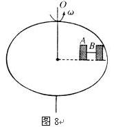 如图8所示,在匀速转动的水平圆盘上,沿半径方向放置两个用细线相连的质量均为m的小物体A、B,它们到转轴的距离分别为