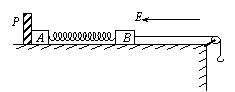 如图,在水平桌面上一根弹簧两端分别连着A、B两个小物块,A、B质量分别为m1和m2,都带正电,电量分别为q1和q2,其中A挨着固定挡板P,一不可伸长的轻绳跨过滑轮,一端与B连接,另一端连接一轻质小钩.整个装置处于场强为E、方向水平向左的匀强电场中. A、B开始时静止,,弹簧的劲度系数为k,不计一切摩擦及A、B间的库仑力,A、B所带电荷量保持不变,B不会碰到滑轮。