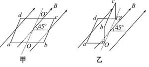 如图甲所示,一个电阻为R、面积为S的矩形导线框abcd,水平放置在匀强磁场中,磁场的磁感应强度为B,方向与ad边垂直并与线框平面成45°角,O、O′分别是ab边和cd边的中点.现将线框右半边ObcO′绕OO′逆时针旋转90°到图7乙所示位置.在这一过程中,导线中通过的电荷量是 ( )