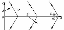 如图所示,在正交坐标系xOy的第一、四象限内分别存在两个大小相等、方向不同的匀强电场,两组平行且等间距的实线分别表示两个电场的电场线,每条电场线与x轴所夹的锐角均为60°.一质子从y轴上某点A沿着垂直于电场线的方向射入第一象限,仅在电场力的作用下第一次到达x轴上的B点时速度方向正好垂直于第四象限内的电场线,之后第二次到达x轴上的C点.求OB与BC的比值。![]()