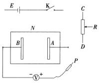 电源E(电动势为12V,内阻不计),木板N(板上从下往上依次叠放白纸、复写纸、导电纸各一张),两个金属条A、B(平行放置在导电纸上,与导电纸接触良好,用作电极),滑线变阻器R(其总阻值小于两平行电极间导电纸的电阻),直流电压表V(量程为6V,内阻很大,其负接线柱与B极相连,正接线柱与探针P相连),开关K.现要用图中仪器描绘两平行金属条AB间电场中的等势线.AB间的电压要求取为6V.
