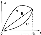如图所示,A、B、C三物体从同一地点、同时出发沿x轴方向做直线运动的位移—时间图象,在0~t0时间内![]()