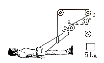 在医院里常用图所示装置对小腿受伤的病人进行牵引治疗,其中a为动滑轮,其他滑轮为定滑轮.不计滑轮的摩擦和绳子的质量,绳子下端所挂重物的质量是5 kg,问: