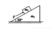 (8分)如图所示,质量为m1=5 kg的滑块,置于一粗糙的斜面上,用一平行于斜面的大小为30 N的力F推滑块,滑块沿斜面向上匀速运动,斜面体质量m2=10 kg,且始终静止,取g=10 m/s2,求: