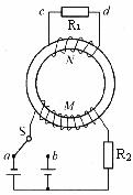 M和N是绕在同一个环形铁芯上的两个线圈,绕法和线路如图所示。现将开关S从a处断开,然后合向b处.在此过程中,通过电阻R1的电流方向是( )