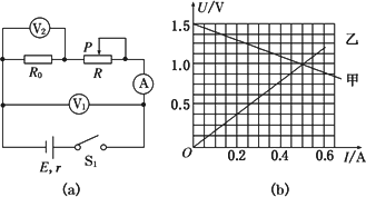 (11分) 两位同学在实验室中利用如图(a)所示的电路测定定值电阻R0、电源的电动势E和内电阻r,调节滑动变阻器的滑动触头P向某一方向移动时,一个同学记录的是电流表A和电压表V1的测量数据,另一同学记录的是电流表A和电压表V2的测量数据.并根据数据描绘了如图(b)所示的两条U-I图线.回答下列问题: