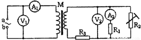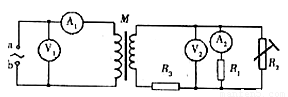 如图所示,a、b间接入电压u=311sin314t(V)的正弦交流电,变压器右侧部分为一火警报警系统原理图,其中R2为用半导体热敏材料制成的传感器,所有电表均为理想电表,电流表A2为值班室的显示器,显示通过R1的电流,电压表V2显示加在报警器上的电压(报警器未画出),R3为一定值电阻。当传感器R2所在处出现火情时,以下说法中正确的是     (    )