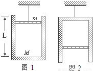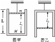 一个内壁光滑的圆柱形气缸,质量为M,底面积为s,缸内有一个质量为m的活塞,封闭了一定质量的理想气体,不计活塞厚度。当温度为t0时,如果用绳子系住活塞将气缸悬挂起来,如图甲所示,气缸内气体柱的高为L1,如果用绳子系住气缸底,将气缸倒过来悬挂起来,如图乙所示,气缸内气体柱的高为L2,设两种情况下气缸都处于竖直状态,求:当时的大气压强。![]()