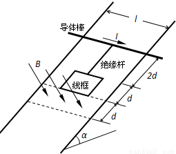 如图所示,两平行的足够长光滑金属导轨安装在一光滑绝缘斜面上,导轨间距为l,导轨电阻忽略不计,导轨所在平面的倾角为α,匀强磁场的宽度为d,磁感应强度大小为B、方向与导轨平面垂直向下.长度为2d的绝缘杆将导体棒和正方形的单匝线框连接在一起,总质量为m,置于导轨上.导体棒中通以大小恒为I的电流,方向如图所示(由外接恒流源产生,图中未图出).线框的边长为d(d<l),电阻为R,下边与磁场区域上边界重合.将装置由静止释放,导体棒恰好运动到磁场区域下边界处返回,导体棒在整个运动过程中始终与导轨垂直.重力加速度为g.问: