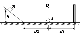(12分)一轻质细绳一端系一质量为m=0.05kg的小球A,另一端挂在光滑水平轴O上,O到小球的距离为L=0.1m,小球跟水平面接触,但无相互作用,在球的两侧等距离处分别固定一个光滑的斜面和一个挡板,如图所示,水平距离s为2m,动摩擦因数为0.25.现有一小滑块B,质量也为m,从斜面上滑下,与小球碰撞时交换速度,与挡板碰撞不损失机械能(原速返回).若不计空气阻力,并将滑块和小球都视为质点,g取10m/s2,试问: