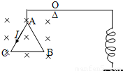 如图所示,质量为m、总长度为L的等边三角形ABC导线框,在A处用细线竖直悬挂于轻杆一端,水平轻杆另一端通过弹簧连接地面,离杆左端1/3处有一固定转轴O。现垂直于ABC施加一个水平方向广阔的匀强磁场,磁感强度为B,当在三角形ABC导线框中通以逆时针方向大小为I的电流时,AB边受到的安培力大小是 ,此时弹簧对杆的拉力大小为_______。