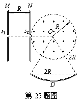 如图所示,相距为R的两块平行金属板M、N正对着放置,s1、s2分别为M、N板上的小孔,s1、s2、O三点共线,它们的连线垂直M、N,且s2O=R。以O为圆心、R为半径的圆形区域内存在磁感应强度为B、方向垂直纸面向外的匀强磁场。D为收集板,板上各点到O点的距离以及板两端点的距离都为2R,板两端点的连线垂直M、N板。质量为m、带电量为+q的粒子,经s1进入M、N间的电场后,通过s2进入磁场。粒子在s1处的速度和粒子所受的重力均不计。