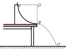 如图所示,竖直平面内有四分之一圆弧轨道固定在水平桌面上,圆心为O点。一小滑块自圆弧轨道A处由静止开始自由滑下,在B点沿水平方向飞出,落到水平地面C点。已知小滑块的质量为m=1.0kg,C点与B点的水平距离为1m,B点离地面高度为1.25m,圆弧轨道半径R=1m,g取10m/s2。求小滑块:![]()