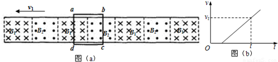如图(a)所示,水平面上有两根很长的平行导轨,间距为L,导轨间有竖直方向等距离间隔的匀强磁场B1和B2,B1和B2的方向相反,大小相等,即B1=B2=B.导轨上有矩形金属框abcd,其总电阻为R,质量为m,框的宽度ab与磁场间隔相同.开始时,金属框静止不动,当两匀强磁场同时以速度v1沿直导轨匀速向左运动时,金属框也会随之开始沿直导轨运动,同时受到水平向右、大小为f的恒定阻力,并很快达到恒定速度.求: