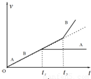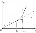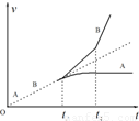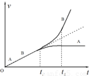 如图所示,带正电的物块A放在不带电的小车B上,开始时都静止,处于垂直纸面向里的匀强磁场中。t=0时加一个水平恒力F向右拉小车B,t=t1时A相对于B开始滑动。已知地面是光滑的。AB间粗糙,A带电量保持不变,小车足够长。从t=0开始A、B的速度—时间图象,下面哪个可能正确?