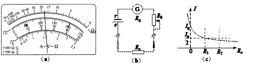 (2)多用电表测未知电阻阻值的电路如图(b)所示,电池的电动势为ε、内阻为r, R0为调零电阻,Rg为表头内阻,电路中电流I与待测电阻的阻值Rx关系图像如图(c)所示,