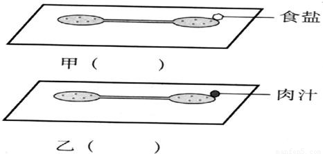图甲、乙表示两块载玻片,分别在载玻片两端各滴一滴草履虫培养液,并使两滴培养液连通,在两块载玻片右侧培养液的边缘分别放一小粒食盐和一滴肉汁,请分析: