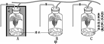 ①取盆栽牵牛花植株放在暗处一昼夜后,将植株枝条上长势、大小相同的三个叶片分别置于A、B、C三个透明塑料软瓶内,密封瓶口,设为甲装置,其他处理见图;