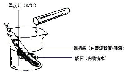 (1)这五只试管中加碘后完全不呈现出蓝色的是________号试管.说明该试管内馒头中的淀粉已经被消化成了________. (2).如果该试管还要探究唾液淀粉酶在高温条件下(100℃)是否还能消化淀粉,还需设⑥号试管作对照试验,那么,⑥号试管所设的条件,除温度不同外,其余条件应与________号试管完全相同.(3).选出属于对照实验的一项________A、①和③B、②和④C、②和⑤D、④和⑤ (4).根据实验结果,得出淀粉在口腔内被初步分解消化的条件有________ A、唾液淀粉酶、舌的搅拌、牙齿的咀嚼 B、舌的搅拌、牙齿的咀嚼、37℃的温度 C、唾液淀粉酶、舌的搅拌、牙齿的咀嚼、37℃的温度 D、唾液淀粉酶、舌的搅拌、牙齿的咀嚼、5℃的温度. 请你参照下图,回答下面问题。图中的实验要进行大约40分钟。 (1)实验开始时,下列哪项陈述是正确的? [ ] A.烧杯的水中含有淀粉 B.烧杯的水中含有唾液 C.烧杯的水中含有麦芽糖 D.烧杯的水中不含淀粉也不含麦芽糖 (2)40分钟后,将会出现什么现象? [ ] A.烧杯的水中含有淀粉 B.烧杯的水中含有麦芽糖 C.烧杯的水中同时含有淀粉和麦芽糖 D.烧杯的水中不含淀粉也不含麦芽糖 (3)下列哪些叙述可以解释上述现象? [ ] ①淀粉属于大分子物质,不能穿过透析袋; ②麦芽糖分子较小,可以穿过透析袋; ③唾液中含有酶,可以将淀粉分解为麦芽糖; ④在37℃时,唾液会被分解为麦芽糖。 [ ] A.①②③④ B.①②③