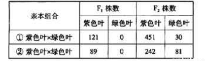 (2)表中组合①的两个亲本基因型为____ _ ,理论上组合①的F2紫色叶植株中,纯合子所占的比例为____ _ _。