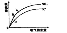 右图是水稻在不同的含氧情况下从硝酸钾溶液吸收K+和NO3-的曲线。影响A、B两点和B、C两点吸收量不同的因素分别是