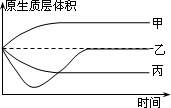 将同一植物细胞分别放在清水、0.3 g/mL的蔗糖溶液和0.3 g/mL的KNO3溶液(K+和NO3-均可被细胞吸收)溶液中,测得细胞原生质层的体积随时间的变化曲线(如下图所示)。则甲、乙、丙依次代表