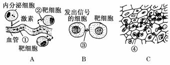 (1)图A表示通过细胞分泌的化学物质,随①________________到达全身各处,与靶细胞表面的②________________结合,将信息传递给靶细胞。