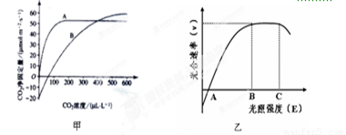 (1)甲图表示A、B两种植物的光照等其他条件适宜的情况下,光合作用强度对环境中CO2浓度变化的响应特性。据图判断在CO2浓度为300μL·L-1 (接近大气CO2浓度)时,净光合作用强度较高的植物是_______________。