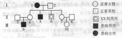 (08广州市综合测试)(7分)科学家发现睾丸决定基因是睾丸发育的必要条件,人睾丸决定基因一般位于Y染色体上,当含该基因的一段Y染色体易位到其它染色体上,人群中会出现性染色体组型为XX的男性(每20000名男子中有一个)。下列为某家系患某种伴性遗传病的遗传图谱,请分析回答: