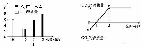 图甲表示水稻的叶肉细胞在光照强度分别为a、b、c、d时,单位时间内CO2释放量和O2产生总量的变化。图乙表示蓝藻光合作用速率与光照强度的关系。有关说法正确的是:( )
