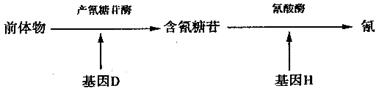 牧草中,白花三叶草有两个稳定遗传的品种,叶片内含氰(HCN)和不含氰的。经调查研究发现,该植物叶片内的氰化物是经过下图生化途径产生的。并查明这两个基因D(d)、H(h)位于两对不同的同源染色体上。