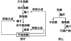 大肠杆菌以天冬氨酸为原料,经过一系列中间反应,生成甲硫氨酸,当甲硫氨酸达到一定浓度时,就会阻止这个代谢途径中三种酶的合成,以调节甲硫氨酸的合成量(图甲);用葡萄糖和乳糖作碳源的培养基培养大肠杆菌,开始时,大肠杆菌只能利用葡萄糖合成代谢产物,只有当葡萄糖消耗完毕才开始利用乳糖合成代谢产物(图乙)。下列说法正确的是()