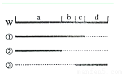 已知a、b、c、d是某细菌DNA片段上的4个基因,右图中W表示野生型,①、②、③分别表示三种缺失不同基因的突变体,虚线表示所缺失的基因。若分别捡测野生型和各种突变体中某种酶的活性,发现仅在野生型和突变体①中该酶有活性,则编码该酶的基因是