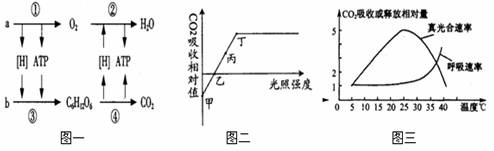 (09湖南十二校联考)(6分)下图一表示绿色植物叶肉细胞内发生的光合作用和有氧呼吸的过程,其中a、b为光合作用的原料,①~④表示相关过程。图二、图三表示外界相关条件对植物光合作用和呼吸作用的影响。请据图回答: