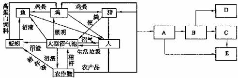 (4)右上图是能量流经鸡种群的示意图,其中A表示鸡的摄入量,D表示鸡自身的呼吸消耗量,那么B中的能量表示 ;此生态系统能量流动的特点是 。