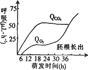某个研究性学习小组,对哈蜜瓜种子的萌发过程进行研究,右图是他们根据实验结果绘制的曲线图,其中QCO2表示CO2的释放量,QO2表示O2的吸收量。下列解释中,不正确的是()![]()