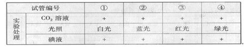 将在黑暗中放置一段时间的叶片均分4块,置于不同的试管中,(注:“+”表示具有该条件)