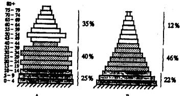 下图为A、B两个地区的人口年龄组成示意图。设A地区的人口增长率为a,B地区的人口增长率为b,那么a与b的数量关系是?( )?